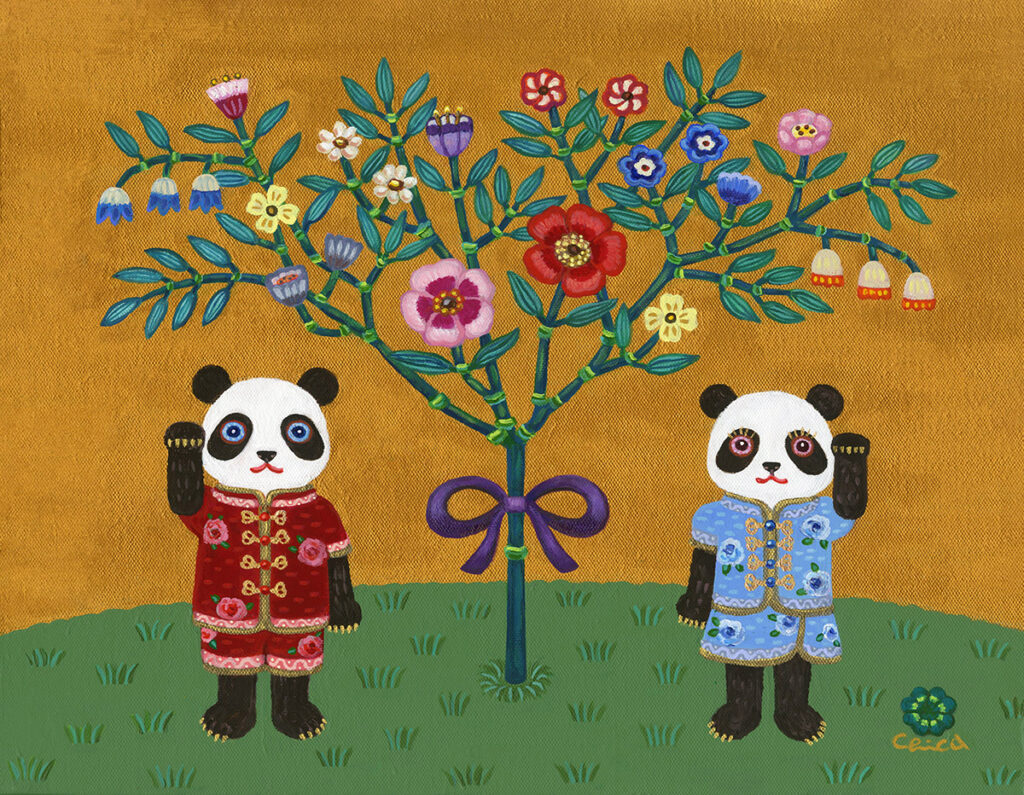 Maneki Panda with blooming banboo